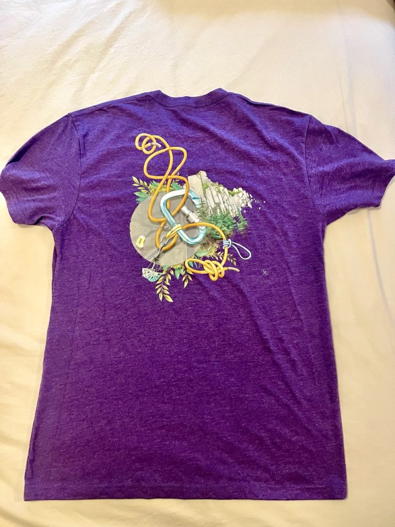 Oh right, that’s just the front of the shirt. Here is the awesome design on the back – nuts, cams, carabiners, rope and good ol’ basalt rock: